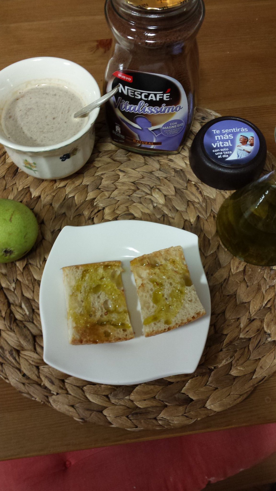 Y desde que he cambiado los desayunos y a la leche me pongo el Nescafé Vitalissimo, el magnesio que lleva me da ese plus de energía para durar más que las pilas!! ;-) Mi desayuno es así: unas tostadas con aceite de oliva virgen extra (no puedo empezar el día sin él), una fruta y un buen tazón de leche semidescremada con Vitalissimo de Nescafé. Me enviaron unas muestras y un bote para que lo probara y lo diera a probar, y la verdad es que me ha convencido a mí y a mi entorno.